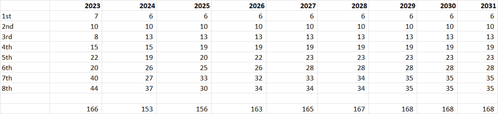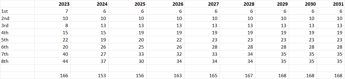 In our area, we give free registration to new players. This was done to rebuild numbers after the idiotically destructive COVID response. Our highest registration ever was 332 players back in 2009. It dropped to an all time low of 97 in 2020. It has since rebounded into the 160s. We expect to land around 70 new players this year. If we can attract 70 new players each subsequent season, maintain 75% retention, and the kids enter at the historical pattern of grade distribution, we expect to stabilize at about 160 players each year and remain solvent.